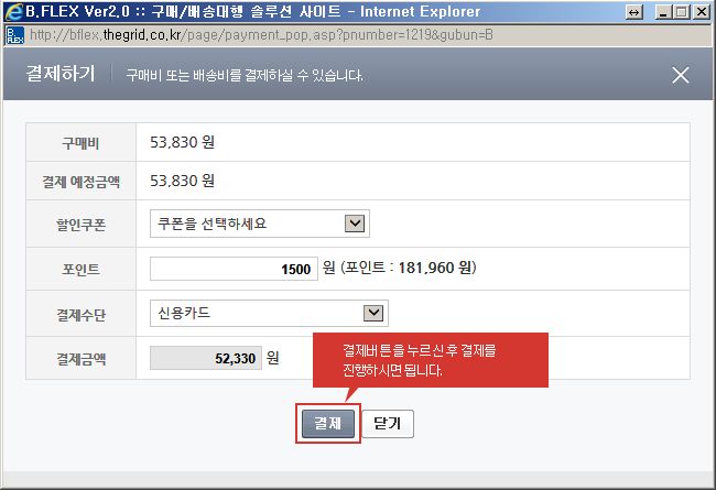 결제팝업에서 쿠폰 및 포인트를 사용하여, 구매비를 결제하실 수 있습니다.