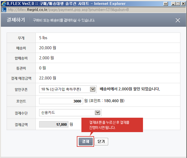 결제팝업에서 쿠폰 및 포인트를 사용하여, 배송비를 결제하실 수 있습니다.